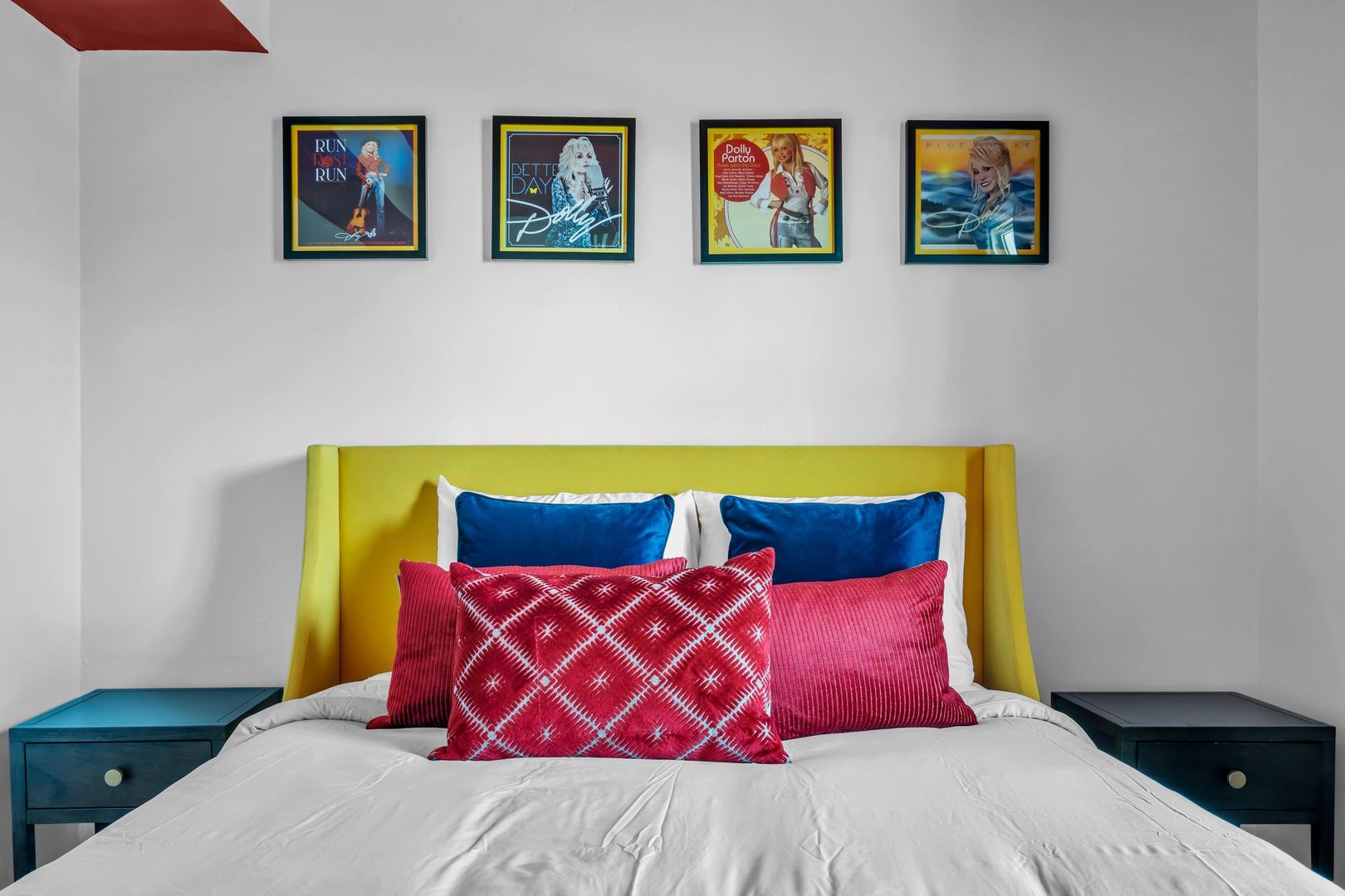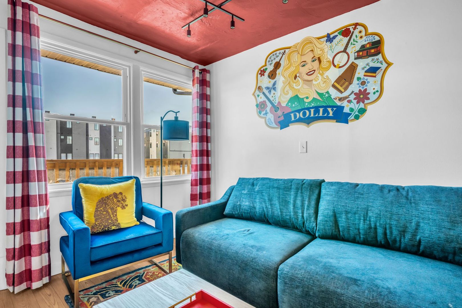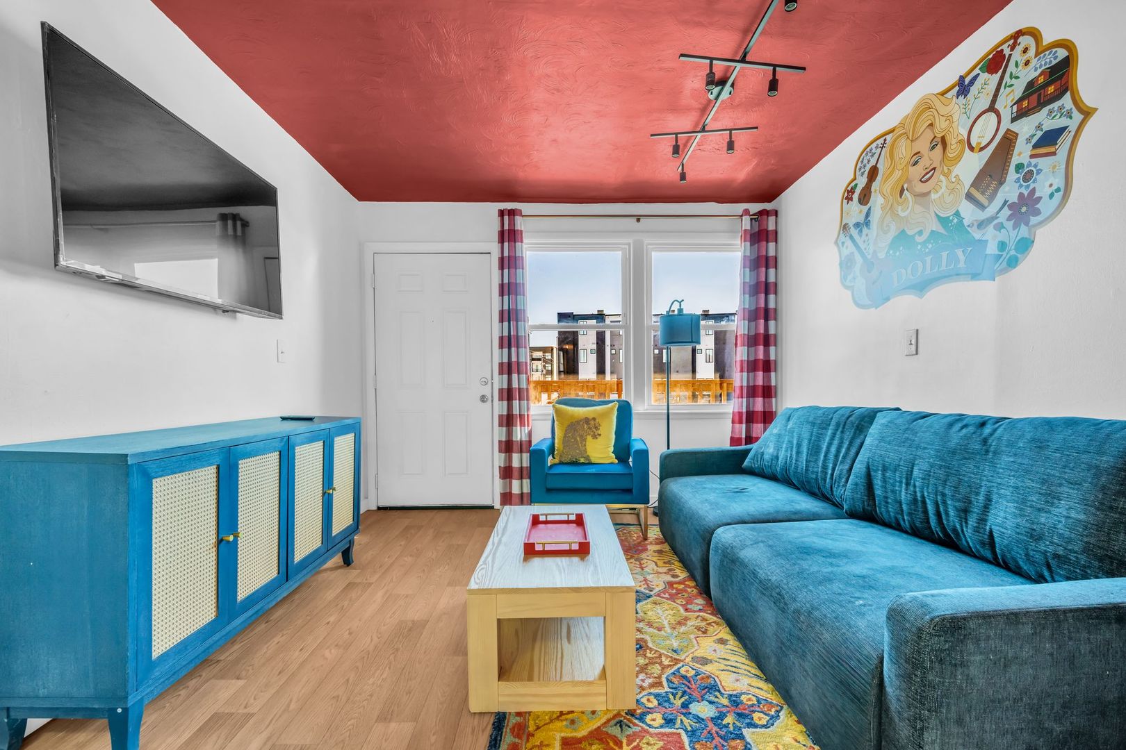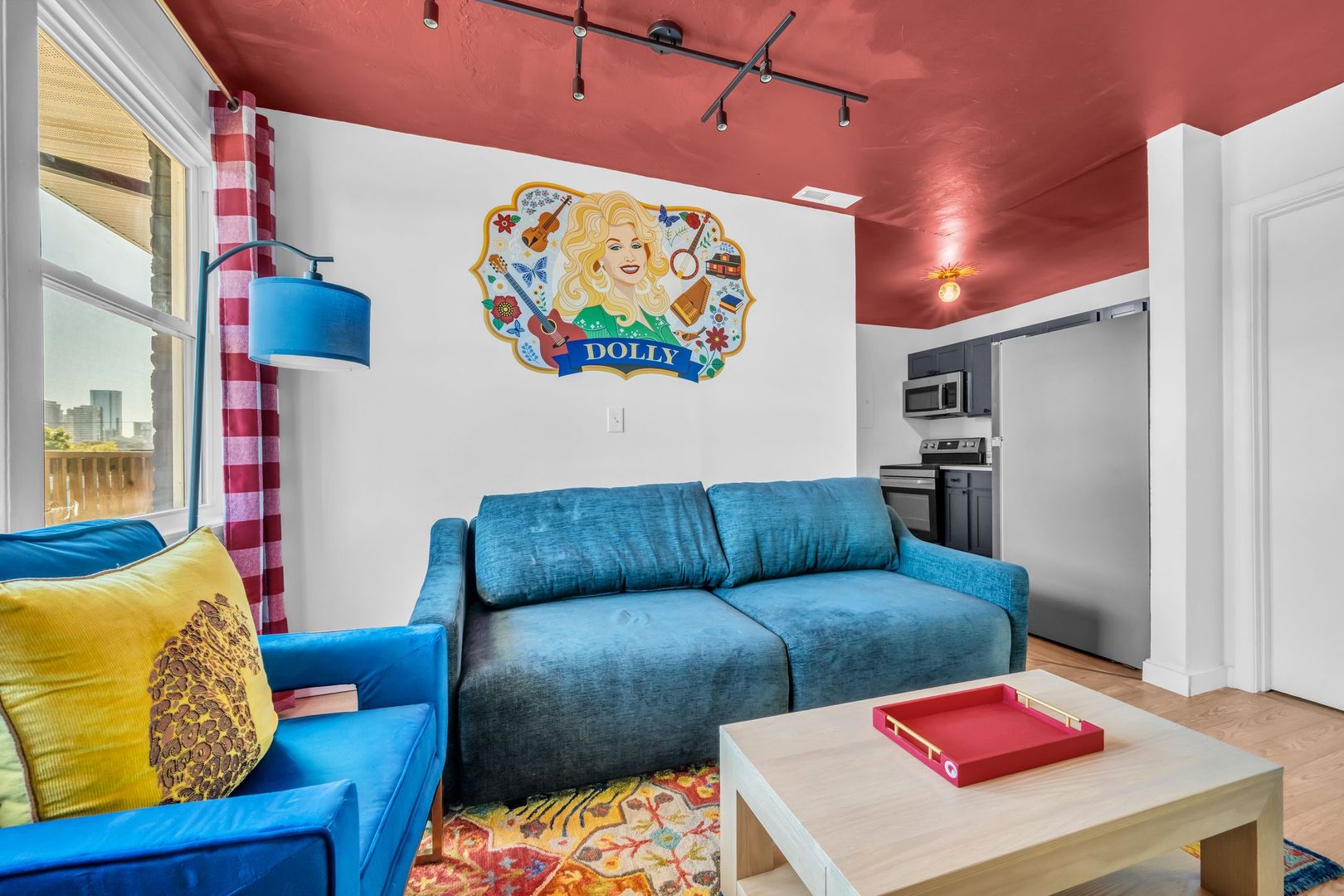 Bright, welcoming, and full of Southern soul — The Dolly Parton Suite is as charming as its namesake. This spacious two-bedroom apartment features one room with a queen bed and another with two twin beds, plus a pull-out couch in the living room for extra guests. With a mix of playful color and cozy comfort, this suite brings a little sparkle and warmth to every stay. Perfect for families, friends, or anyone looking for a Nashville stay that feels like home.