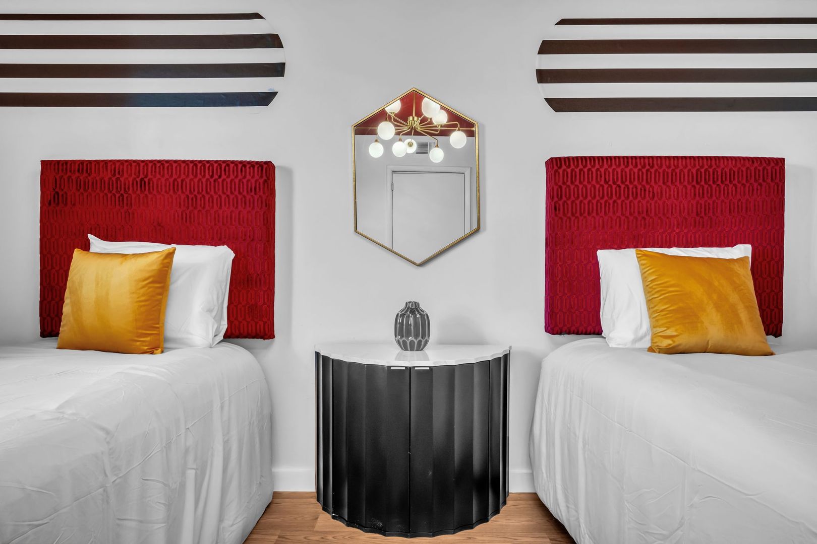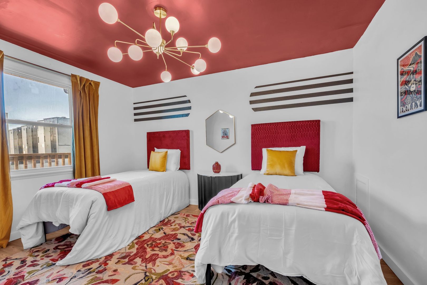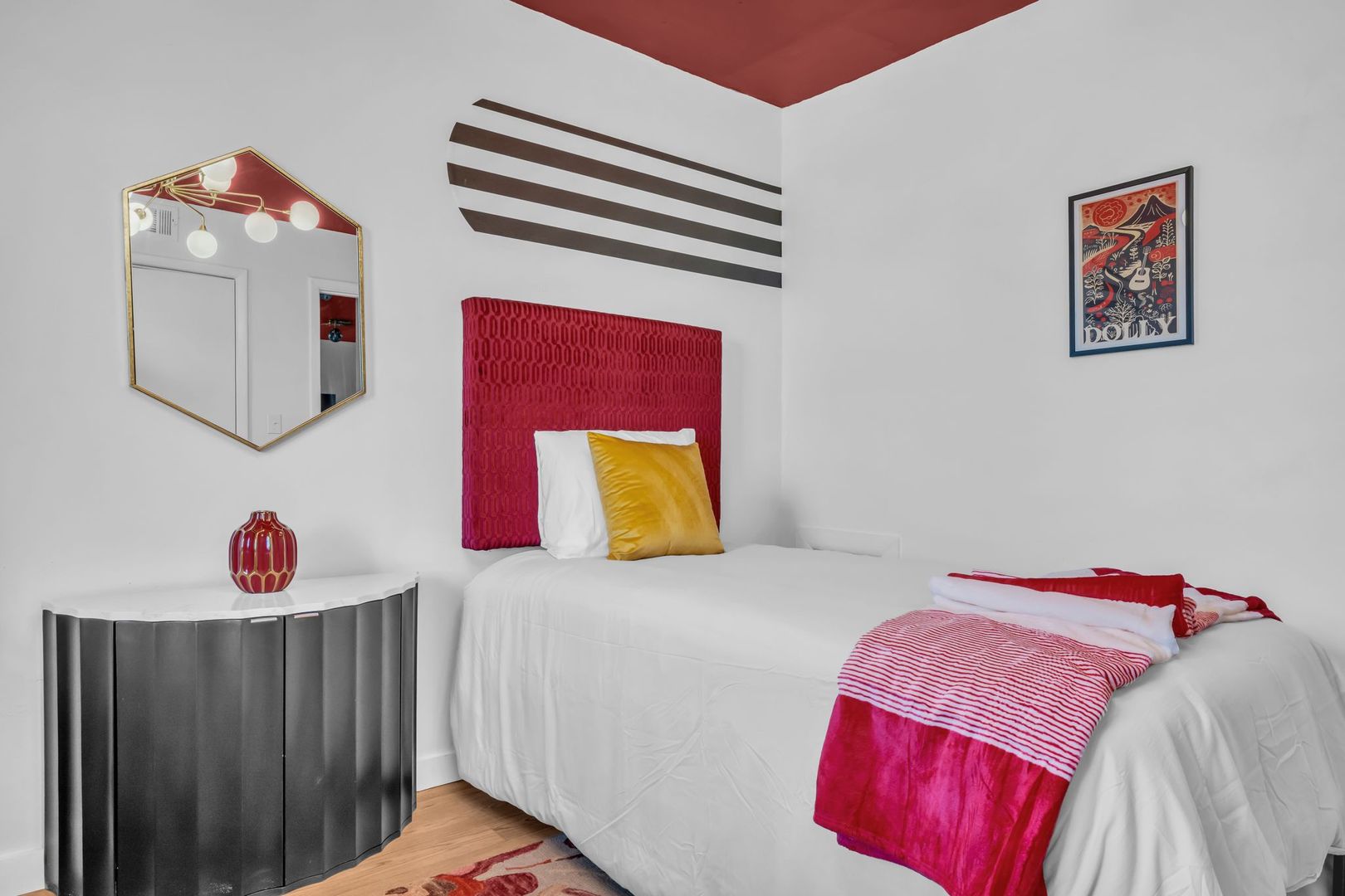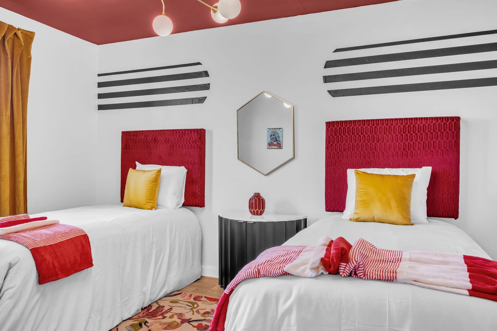 Bright, welcoming, and full of Southern soul — The Dolly Parton Suite is as charming as its namesake. This spacious two-bedroom apartment features one room with a queen bed and another with two twin beds, plus a pull-out couch in the living room for extra guests. With a mix of playful color and cozy comfort, this suite brings a little sparkle and warmth to every stay. Perfect for families, friends, or anyone looking for a Nashville stay that feels like home.